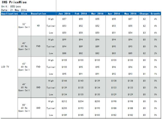 IHS公布了最新電視價(jià)格面板更新于2016年5月21日,數(shù)據(jù)顯示,32英寸720P高清面板,價(jià)格最高上漲3美元,最高報(bào)價(jià)為57美元。40英寸1080P全高清面板,價(jià)格最高上漲2美元,最高報(bào)價(jià)為94美元。43英寸1080P全高清面板,價(jià)格最高上漲1美元,最高報(bào)價(jià)為100美元。