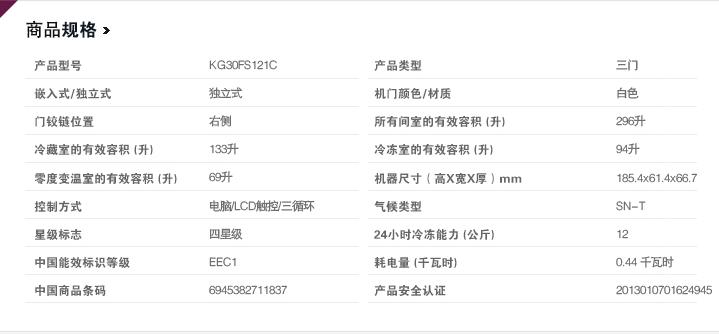 西門子KG30FS121C冰箱總有效容積為296升,其中冷藏室為133升,零度變溫室為69升,冷凍室為94升。總體看來,整體內(nèi)部空間深度從540mm增加至565mm,且優(yōu)化的保溫層等經(jīng)過特別設計,讓內(nèi)部空間極大釋放,容積更大,享受更多鮮美。