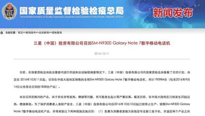 日前,在國家質(zhì)檢總局執(zhí)法督查司進(jìn)行約談和啟動(dòng)缺陷調(diào)查情況下,三星(中國)投資有限公司向國家質(zhì)檢總局備案了召回計(jì)劃,決定自 2016年10月11日起,召回在中國大陸地區(qū)銷售的全部SM-N9300 Galaxy Note 7數(shù)字移動(dòng)電話機(jī),共計(jì)190984臺(tái)(包含2016年9月14日公告首次召回的1858臺(tái)產(chǎn)品)。
