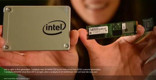 近日,TMHW拿到了一份Intel的年度回顧文件,其中出現(xiàn)了一款神奇的SSD新品。圖中,Intel介紹,最左邊是2016年的第一代1TB 3D閃存SSD,中間是第二代,右邊是明年的第三代,顯然,他們分別代表2.5寸SATA3、M.2和BGA封裝。