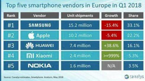 根據(jù)國(guó)外市場(chǎng)研究機(jī)構(gòu)Canalys發(fā)布的《2018年第一季度歐洲智能手機(jī)市場(chǎng)出貨量報(bào)告》顯示,第一季度,歐洲市場(chǎng)排名前五的廠商為三星、蘋(píng)果、華為、小米和諾基亞。其中華為智能手機(jī)和小米在歐洲市場(chǎng)出貨量同均有大幅增長(zhǎng)。