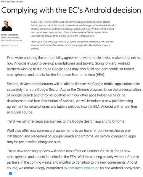 這些新的許可選項(xiàng)將于2018年10月29日生效,用于在歐洲經(jīng)濟(jì)區(qū)推出的所有新智能手機(jī)和平板電腦。我們將在未來(lái)幾周和幾個(gè)月內(nèi)與我們的Android合作伙伴積極交涉并轉(zhuǎn)換新協(xié)議。當(dāng)然,我們?nèi)匀恢铝τ跒锳ndroid生態(tài)系統(tǒng)提供創(chuàng)新。