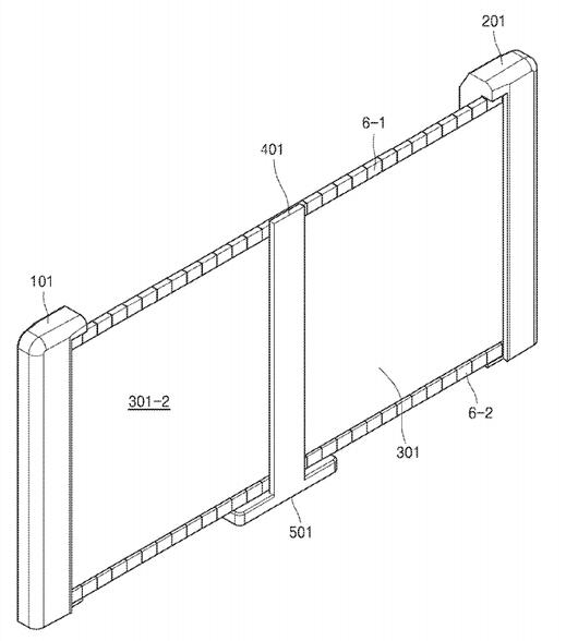 與 LG 的OLED產(chǎn)品不同,三星的這項專利,描述了水平式的卷筒方案。屏幕兩側(cè)的卷筒,為其提供了機械結(jié)構(gòu)上的支撐。與垂直的安裝方式相比,要讓柔性顯示屏在水平面上保持平坦,是一個明顯不同的挑戰(zhàn)。