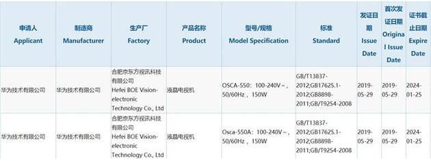 昨日,華為兩款液晶電視已經(jīng)通過3C認(rèn)證,其認(rèn)證型號為OSCA-550/Osca-550A,申請人為華為技術(shù)有限公司,生產(chǎn)廠為合肥京東方視訊科技有限公司。