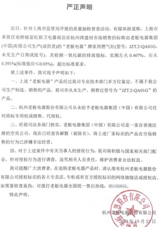 值得一提的是,截止發(fā)稿前,“杭州老板電器股份有限公司”已經(jīng)針對(duì)該事件發(fā)布聲明,指出所謂“老板電器”不合格產(chǎn)品并非旗下生產(chǎn)、銷(xiāo)售型號(hào),且“杭州老板電器股份有限公司”也從未給予“老板電器集團(tuán)(中國(guó))有限公司”任何商標(biāo)專用權(quán)或銷(xiāo)售、代理權(quán)。此外,老板電器還在聲明中特別提出,將積極配合國(guó)家相關(guān)部門(mén),追責(zé)相關(guān)責(zé)任人,維護(hù)消費(fèi)者合法權(quán)益。