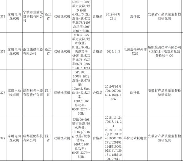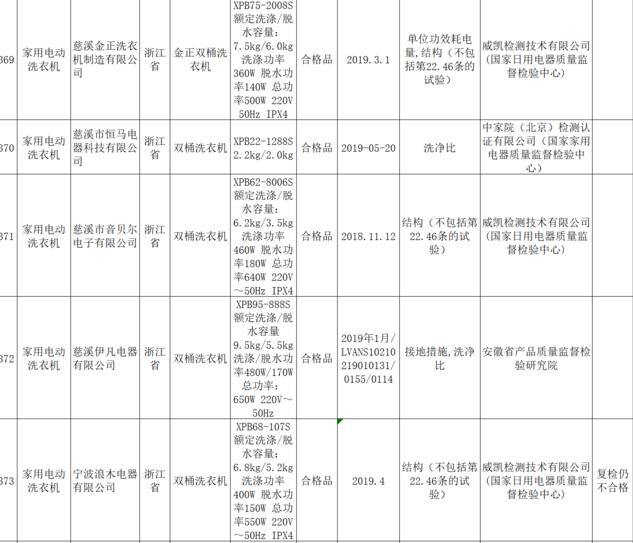 在家用電動洗衣機方面,抽查了8個。ㄊ校58家企業(yè)生產(chǎn)的60批次家用電動洗衣機產(chǎn)品,其中9批次產(chǎn)品不合格,不合格發(fā)現(xiàn)率為15.0%。不合格項目涉及接地措施、單位功效耗電量、洗凈比等。涉及的企業(yè)包括慈溪市恒馬電器科技有限公司、慈溪市音貝爾電子有限公司、慈溪伊凡電器有限公司等。值得注意的是,寧波浪木電器有限公司生產(chǎn)的1批次雙桶洗衣機復(fù)檢仍不合格。