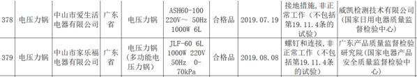 在電壓力鍋方面,抽查了6個省(市)40家企業(yè)生產(chǎn)的40批次電壓力鍋產(chǎn)品,其中2批次產(chǎn)品不合格,不合格發(fā)現(xiàn)率為5.0%。不合格項目涉及非正常工作、接地措施、螺釘和連接。涉及的企業(yè)為中山市愛生活電器有限公司和中山市家樂福電器有限公司。