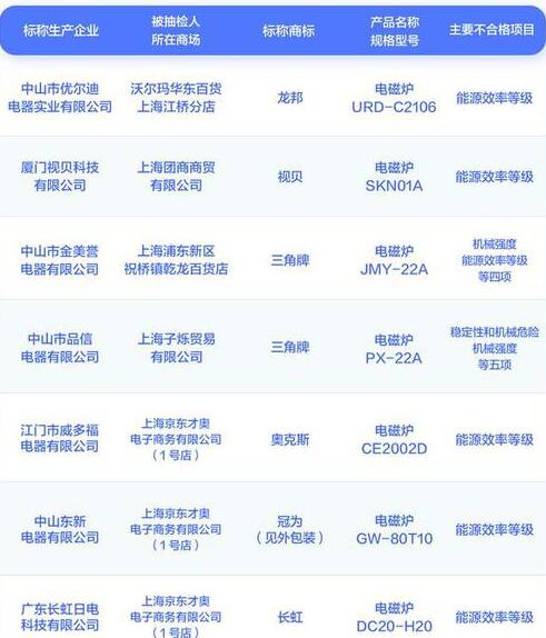 12月12日,上海市市場(chǎng)監(jiān)督管理局發(fā)布電磁灶產(chǎn)品質(zhì)量監(jiān)督抽查結(jié)果,抽查29批次產(chǎn)品,經(jīng)檢驗(yàn)不合格7批次。其中,奧克斯、長(zhǎng)虹、三角牌等品牌上榜。上海京東才奧電子商務(wù)有限公司(1號(hào)店)銷售的標(biāo)稱商標(biāo)為奧克斯的電磁爐(規(guī)格型號(hào)CE2002D),以及標(biāo)稱商標(biāo)為長(zhǎng)虹的電磁爐(規(guī)格型號(hào)DC20-H20),能源效率等級(jí)不合格