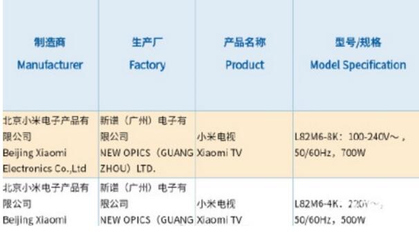 據(jù)了解,這兩款小米新電視均配備82英寸屏幕,由新浦(廣州)電子有限公司代工。