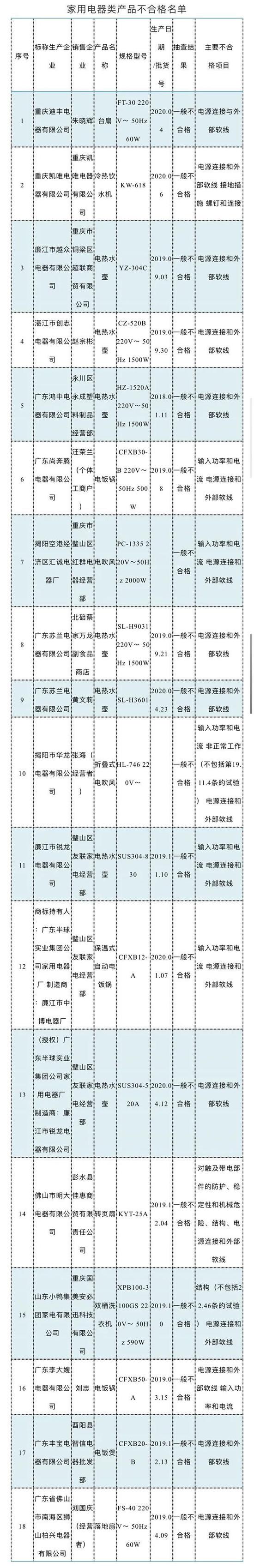 近日,重慶市市場(chǎng)監(jiān)督管理局網(wǎng)站通告2020年家用電器等3種產(chǎn)品質(zhì)量監(jiān)督抽查情況。