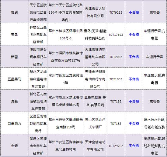 此次共抽查產(chǎn)品21批次,合格14批次,問題發(fā)現(xiàn)率為33.3%。不合格產(chǎn)品的商標涉及賽鴿、寶島、新蕾、五星黑馬、真愛、自由動力、金箭。不合格項目涉及車速提示音、充電器、淋水涉水性能、導(dǎo)線布線安裝。