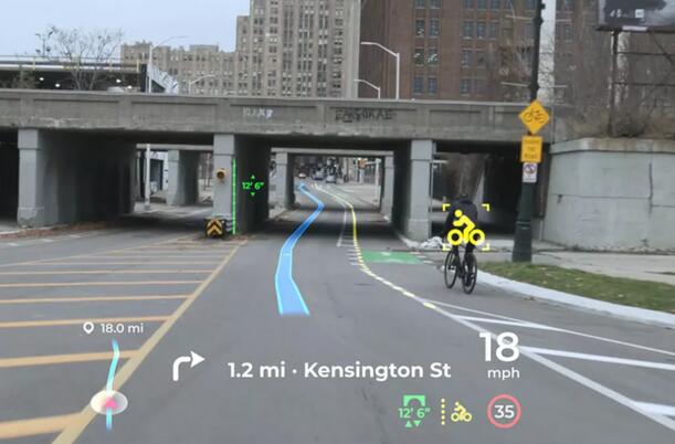從公布的樣本照片可以看到,松下的這個HUD包含了導航導航路線、自行車檢測、速度、地下通道測量以及街道限速等信息。雖然現(xiàn)在市面上的HUD會顯示其中一些信息,但松下提供的所有集成方式無疑是令人愉快的。畢竟人們在車上看其他屏幕的時間越少越好,而HUD能保持人們的眼睛向前并在路上。