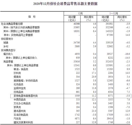 國(guó)家統(tǒng)計(jì)局公布的數(shù)據(jù)顯示,2020年1-12月社會(huì)消費(fèi)品零售總額為391981億元,同比下降3.9%。其中,12月社會(huì)消費(fèi)品零售總額為40566億元,同比增長(zhǎng)4.6%。