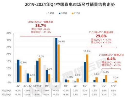 在一片漲價聲中,2021Q1國內(nèi)彩電市場銷量沒有意外地再次下滑。據(jù)奧維云網(wǎng)公布的數(shù)據(jù)顯示,2021Q1國內(nèi)彩電銷量為990萬臺,對比2020Q1下滑0.6%,對比2019Q1下滑20.5%;銷售額為311億元,對比2020Q1增長30.9%。一季度,彩電銷售額增長30.9%主要得益于“消費結構”的升級(即大尺寸和高價產(chǎn)品占比增加),65“及以上的產(chǎn)品銷量占比29.8%,同比2020Q1增長11.1%,同比2019Q1增長16.2%%;而55”以下的產(chǎn)品銷量占比38.78%,同比2020Q1下降8.6%,同比2019Q1下降11.3%;彩電市場呈現(xiàn)了高價產(chǎn)品結構性占比提升,低價位需求端“需求被大幅抑制”的現(xiàn)象。