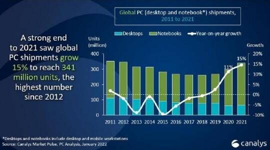2021年全球PC出貨量約為3.41億臺,是2012年以來出貨量最大的一年,比2020年增長15%,比2019年增長27%。2021年四季度PC出貨量增長并不大,相比2020年同期只增長1%。