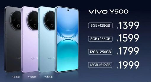 全新vivo Y500提供四種容量版本供選擇,8GB+128GB版本售價1399元、8GB+256GB版本售價1599元、12GB+256GB版本售價1799元、12GB+512GB版本售價1999元。