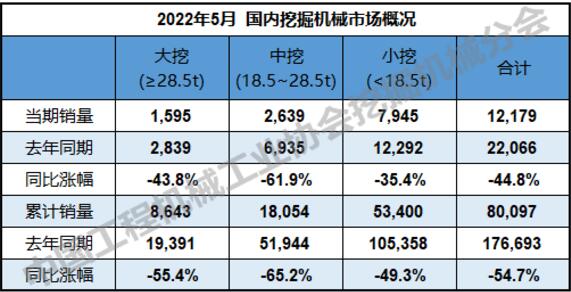 據(jù)中國(guó)工程機(jī)械工業(yè)協(xié)會(huì)對(duì)26家挖掘機(jī)制造企業(yè)統(tǒng)計(jì),2022年5月銷售各類挖掘機(jī)20624臺(tái),同比下降24.2%;其中國(guó)內(nèi)12179臺(tái),同比下降44.8%;出口8445臺(tái),同比增長(zhǎng)63.9%。