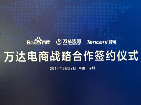 8月29日,萬達、騰訊和百度在深圳聯(lián)合召開發(fā)布會,正式宣布在香港注冊成立電子商務(wù)公司,一期總投資額高達50億人民幣,其中萬達持股70%,騰訊和百度各持股15%。
