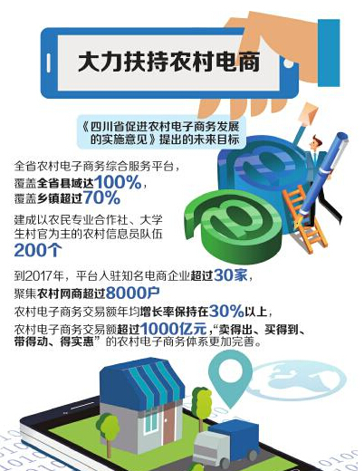 日前,省政府辦公廳印發(fā)《四川省促進(jìn)農(nóng)村電子商務(wù)發(fā)展的實(shí)施意見》(下稱《意見》),明確提出,支持農(nóng)村電商發(fā)展,鼓勵(lì)農(nóng)村“全企入網(wǎng)”、“全民觸電”。力爭在2017年,實(shí)現(xiàn)農(nóng)村電子商務(wù)交易額年均增長率在30%以上,農(nóng)村電子商務(wù)交易額超過千億元。