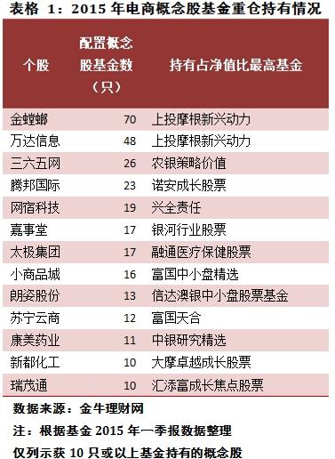 從基金持有電商概念股的情況來看,集中持股現(xiàn)象也比較多。多只概念股都出現(xiàn)被一家基金公司旗下的多只基金重倉持有的情況。這種與坐莊類似的控盤手法將增強(qiáng)基金對(duì)股價(jià)的控制力度,不過,潛在的流動(dòng)性風(fēng)險(xiǎn)也不容忽視。總體來看,電商概念股在政策利好的助推下將迎來新的投資機(jī)會(huì),建議投資者可重點(diǎn)關(guān)注配置電商概念股的基金。