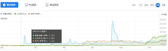 為了測算廣告效果,記者查詢了這三家主要面對C端的二手車對手在百度指數(shù)上的表現(xiàn)。查詢時使用多個用戶常用組合querry,分別是“優(yōu)信+優(yōu)信二手車”、“人人車+人人車二手車”、“瓜子二手車+瓜子網(wǎng)+瓜子”。