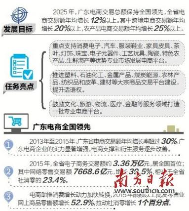 廣東是我國電子商務(wù)發(fā)展的重要增長極之一,為加快電子商務(wù)的應(yīng)用與創(chuàng)新,全面提升我省電子商務(wù)發(fā)展水平和構(gòu)建具有全球競爭力的電子商務(wù)產(chǎn)業(yè)體系,省商務(wù)廳日前印發(fā)《廣東省電子商務(wù)中長期發(fā)展規(guī)劃綱要(2016—2025)》(以下簡稱《綱要》)提出,到2025年,全省電商交易額年均增長12%以上。其中跨境電商交易額年均增長20%以上,農(nóng)產(chǎn)品電商交易額年均增長25%以上。