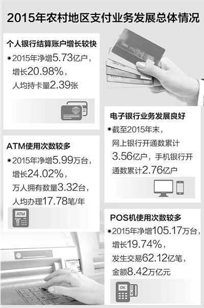 中國人民銀行最新發(fā)布的數(shù)據(jù)顯示,截至2015年末,農(nóng)村地區(qū)個(gè)人銀行結(jié)算賬戶33.04億戶,2015年凈增5.73億戶,增長20.98%。其中,借記卡20.85億張,2015年凈增4.57億張,增長28.06%;信用卡1.36億張,2015年凈增2747.92萬張,增長25.26%;人均持卡量2.39張。可以說,基本實(shí)現(xiàn)了家家有賬戶、人人有卡。