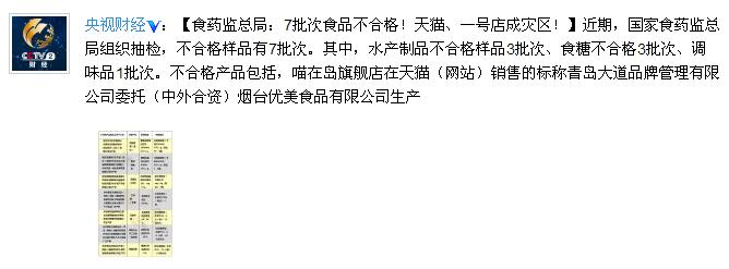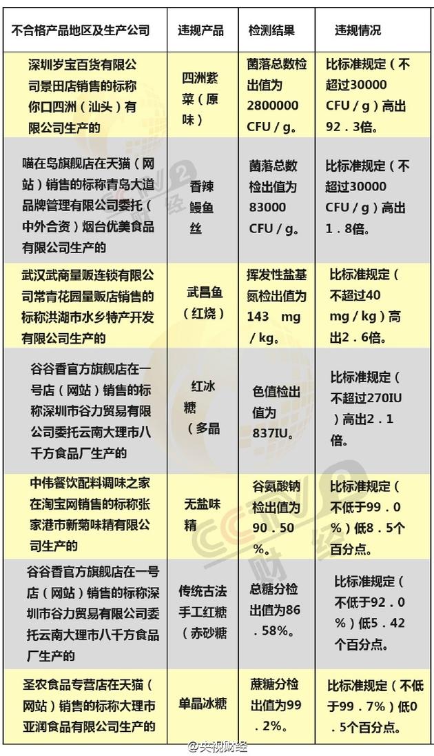 北京時(shí)間7月13日下午消息,央視財(cái)經(jīng)官方微博發(fā)消息稱(chēng),近期,國(guó)家食藥監(jiān)總局組織抽檢,不合格樣品有7批次。其中,水產(chǎn)制品不合格樣品3批次、食糖不合格3批次、調(diào)味品1批次。不合格產(chǎn)品包括,喵在島旗艦店在天貓(網(wǎng)站)銷(xiāo)售的標(biāo)稱(chēng)青島大道品牌管理有限公司委托(中外合資)煙臺(tái)優(yōu)美食品有限公司生產(chǎn)的香辣鰻魚(yú)絲;谷谷香官方旗艦店在一號(hào)店(網(wǎng)站)銷(xiāo)售的標(biāo)稱(chēng)深圳市谷力貿(mào)易有限公司委托云南大理市八千方食品廠生產(chǎn)的紅冰糖(多晶黃冰糖)等。