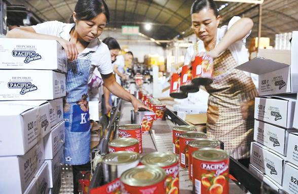 2016年9月21日,在碭山縣興達罐業(yè)食品有限公司內(nèi),工人正在打包通過電商渠道銷往國外的水果罐頭。2015年,該公司水果罐頭出口額約為500萬美元,其中通過電商平臺銷售的占一半。