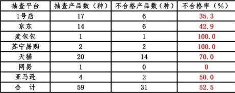 此次共抽查了1號店、京東、麥包包、蘇寧易購、天貓、網(wǎng)易和亞馬遜共7家電商平臺的59批次產(chǎn)品,其中取樣于天貓的20批次樣品14批次不合格,蘇寧易購的2批次樣品和麥包包的1批次樣品,檢測都不合格。