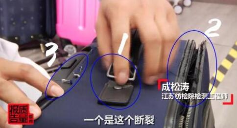 這款市面售價2980元的箱包,做一項監(jiān)測就出現(xiàn)了兩種情況,一個是把手斷裂,另外一個是箱體開裂,并不是價格高一定質(zhì)量好。