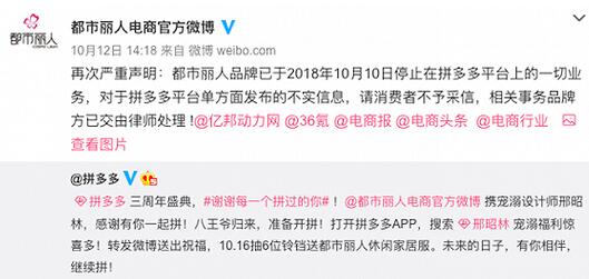 近日,“都市麗人電商官方微博”兩次公開聲明指責(zé)拼多多“發(fā)布不實(shí)營銷內(nèi)容”、“強(qiáng)迫售賣”等行為,并表示已于2018年10月10日停止在拼多多平臺(tái)上的一切業(yè)務(wù)。