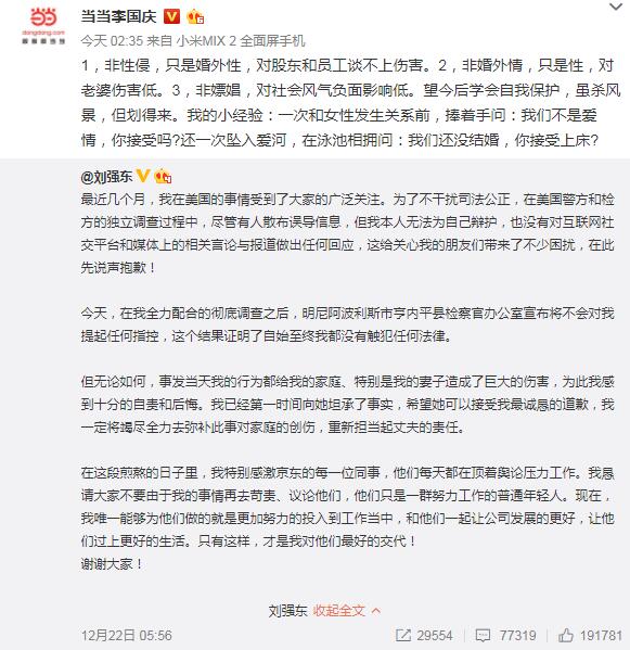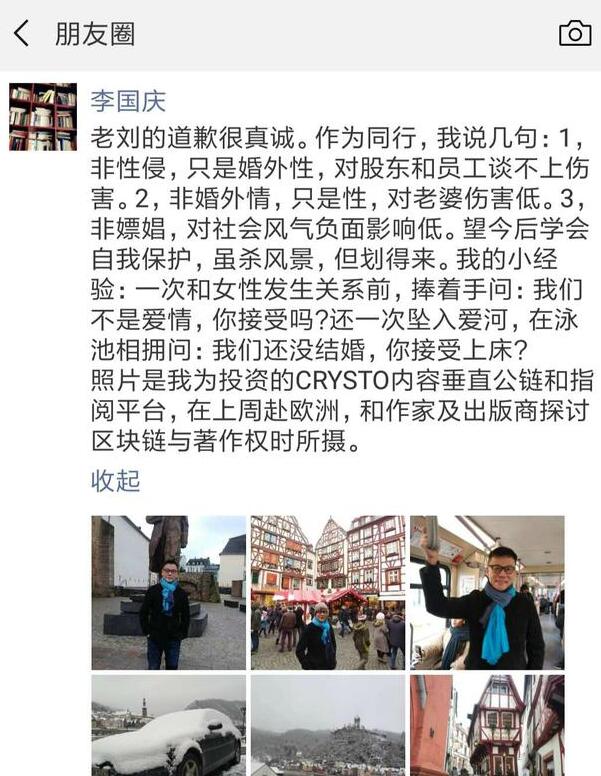 當(dāng)當(dāng)網(wǎng)創(chuàng)始人李國慶談“劉強(qiáng)東案”:1,非性 侵,只是婚外性,對股東和員工談不上傷害。2,非婚外情,只是性,對老婆傷害低。3,非嫖 娼,對社會風(fēng)氣負(fù)面影響低。望今后學(xué)會自我保護(hù),雖殺風(fēng)景,但劃得來。