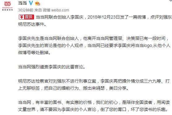 當(dāng)當(dāng)網(wǎng)表示,李國慶離開當(dāng)當(dāng)網(wǎng)管理層、決策層已有一段時(shí)間,關(guān)于劉強(qiáng)東案的言論是他的個(gè)人觀點(diǎn)。