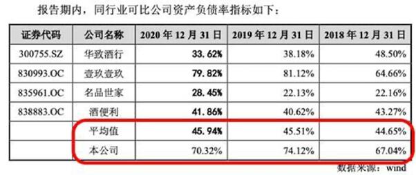 跟證監(jiān)會2021年8月披露的酒仙網招股書, 更新后的IPO說明書特別提示了“償債及流動性風險”。酒仙網在2018年、2019年、2020年報告期的負債率(合并)為67.04%、74.12%和70.32%,經營活動的現金來源于銀行貸款,報告期內分別為1.266億、2.642億和3.48億。
