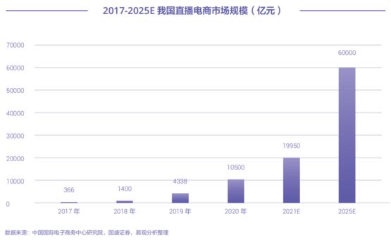 根據(jù)商務(wù)部中國(guó)國(guó)際電子商務(wù)中心研究院發(fā)布的《2021年中國(guó)直播電商產(chǎn)業(yè)研究報(bào)告》顯示,2020年,我國(guó)直播帶貨整體規(guī)模突破1萬(wàn)億元,2021年接近兩萬(wàn)億元,至2025年,直播電商市場(chǎng)規(guī)模預(yù)計(jì)將達(dá)6萬(wàn)億元,直播電商增速喜人。