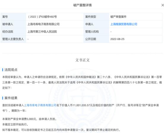 8月25日,天眼查App顯示,上海寺庫電子商務(wù)有限公司(下稱“上海寺庫”)新增一則破產(chǎn)審查案件,申請(qǐng)人為上海維旗貿(mào)易有限公司,經(jīng)辦法院為上海市第三中級(jí)人民法院。而在不久前,上海寺庫剛剛被昔日合作伙伴普拉達(dá)(Prada)申請(qǐng)凍結(jié)1100萬財(cái)產(chǎn),凍結(jié)期為一年,目前這筆資金仍處于凍結(jié)狀態(tài)。