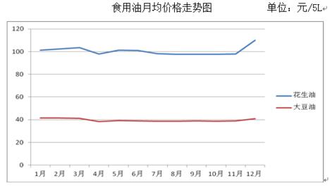 桶裝花生油(當?shù)刂麂N)穩(wěn)中略漲,一季度均價為102.3元/5L,二季度開始震蕩下行,均價降為99.92元/5L,并持續(xù)到11月份,進入12月份,受市場需求增加影響,價格上漲至年內(nèi)最高價位,每桶為110元,相比年初,漲幅為9%;上圖看出,桶裝大豆油(當?shù)刂麂N)價格較為穩(wěn)定,年內(nèi)最高價、最低價、平均價為別為41.4元/5L、38.31元/5L、39.38元/5L,市場運行相對平穩(wěn)。