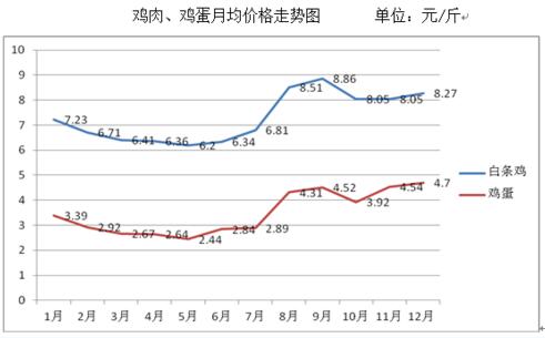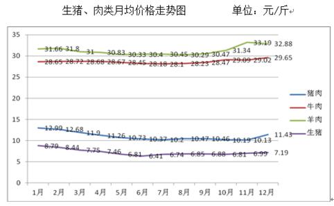 牛肉、羊肉價格溫和上漲。2017年牛肉、羊肉價格震蕩上行,四季度價格上漲至年內(nèi)最高價位,分別為29.65元/斤、32.88元/斤,較年初價格漲幅分別為3%、4%;全年市場均價分別為28.69元/斤、31.29元/斤,相比2016年價格基本持平。