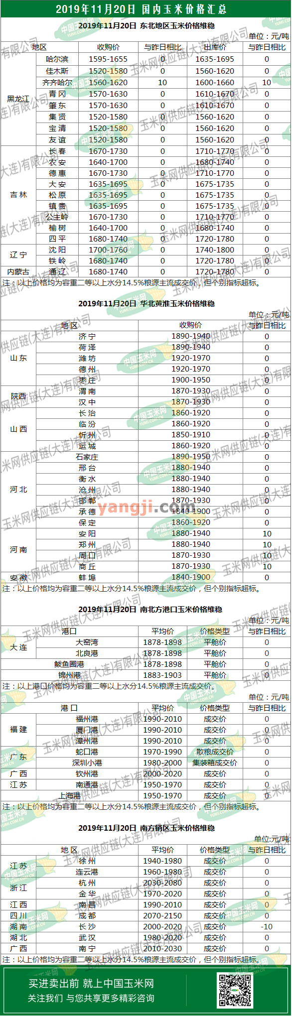 今日全國(guó)玉米均價(jià)為1965元/噸,較昨日下跌30元/噸,較上周下跌30元/噸。今日最高省份:云南省玉米均價(jià)為2268元/噸;今日最高城市:撫順市玉米均價(jià)為2500元/噸;今日最低省份:黑龍江玉米均價(jià)為1780元/噸;今日最低城市:黃山市玉米均價(jià)為1500元/噸;