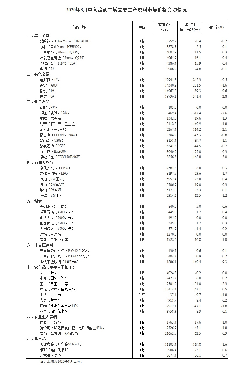 國(guó)家統(tǒng)計(jì)局24日公布2020年8月中旬流通領(lǐng)域重要生產(chǎn)資料市場(chǎng)價(jià)格變動(dòng)情況。據(jù)對(duì)全國(guó)流通領(lǐng)域9大類50種重要生產(chǎn)資料市場(chǎng)價(jià)格的監(jiān)測(cè)顯示,2020年8月中旬與8月上旬相比,27種產(chǎn)品價(jià)格上漲,19種下降,4種持平。