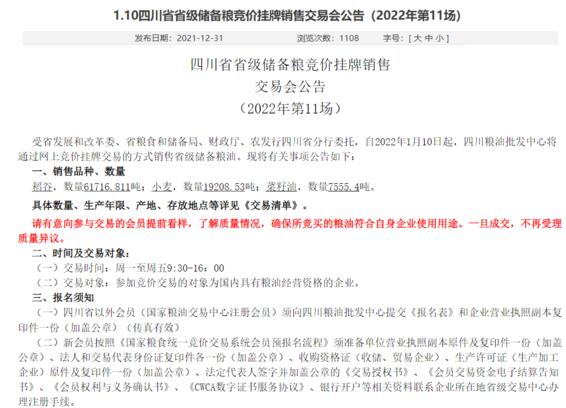自2022年1月10日起,四川糧油批發(fā)中心將通過(guò)網(wǎng)上競(jìng)價(jià)掛牌交易的方式,銷(xiāo)售省級(jí)儲(chǔ)備菜籽油7555.4噸。