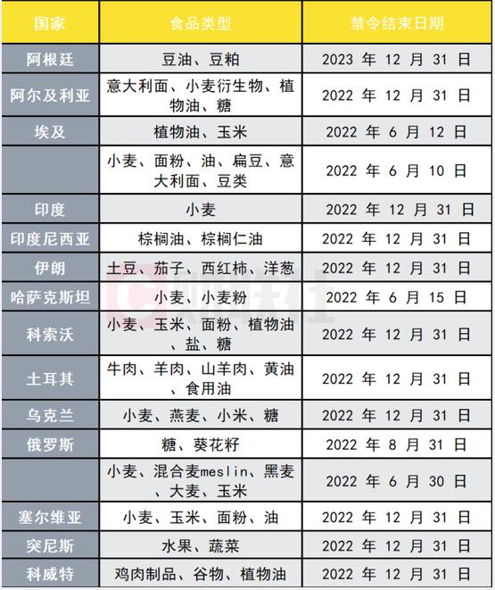 可以看到,包括阿根廷、阿爾及利亞、伊朗、哈薩克斯坦、土耳其、塞爾維亞、突尼斯和科威特等國家在內,已經限制了主要糧食和農作物的出口。受限產品從包括玉米、面粉、黑麥、大麥在內的主食,大豆、動物油、植物油、鹽、糖,以及包括馬鈴薯、茄子、西紅柿、洋蔥在內的蔬菜。此外,各種肉類也涵蓋其中。