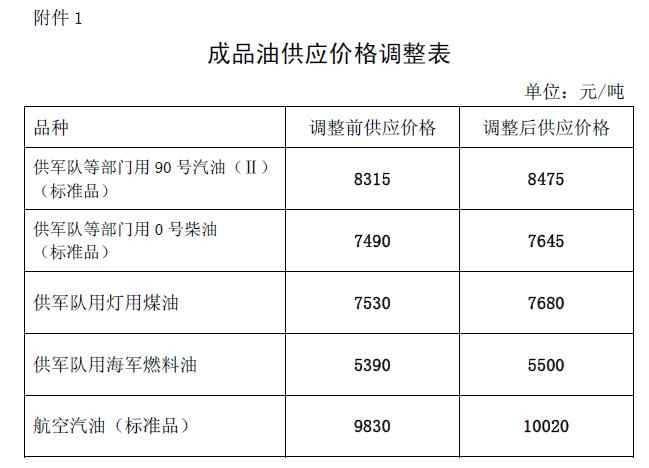 一、成品油生產(chǎn)經(jīng)營企業(yè)供軍隊及新疆生產(chǎn)建設兵團、國家儲備用汽、柴油(標準品,下同)供應價格每噸分別提高160元和155元,調(diào)整后的汽、柴油供應價格分別為每噸8475和7645元。其他成品油價格相應調(diào)整。調(diào)整后的成品油標準品價格見附件1。