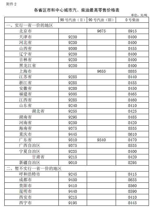 三、各地汽、柴油最高零售價格和批發(fā)價格等額調(diào)整。調(diào)整后各省(區(qū)、市)和中心城市汽、柴油最高零售價格水平見附件2。