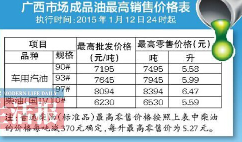廣西市場方面,成品油最高銷售價格調整情況為:90號汽油每升降低0.14元,為5.58元/升;93號汽油每升降低0.14元,為5.99元/升;97號汽油每升降低0.15元,為6.47元/升;0號柴油(國IV)降低了0.19元,為5.59元/升。需要注意的是,普通柴油(標準品)最高零售價格按照上述柴油的價格每噸減370元確定,每升最高零售價為5.27元。此外,根據(jù)國家發(fā)改委的通知,98號汽油價格由成品油生產經營企業(yè)根據(jù)市場情況自主制定具體價格。