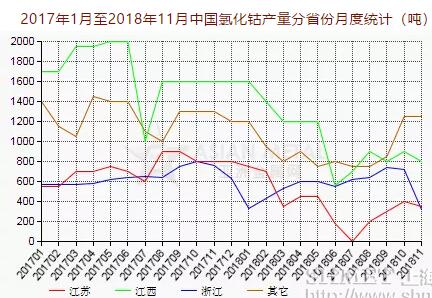 如下圖所示,2018年11月江西省氯化鈷產(chǎn)量為800噸,環(huán)比、同比分別走低11.1%和50%;江蘇省氯化鈷產(chǎn)量為350噸,環(huán)比、同比分別減少12.5%和56.3%;浙江省氯化鈷產(chǎn)量為320噸,環(huán)比走低55.6%,同比下降57.9%;其他省份和地區(qū)氯化鈷產(chǎn)量為1,250噸,環(huán)比持穩(wěn),同比下滑3.8%。