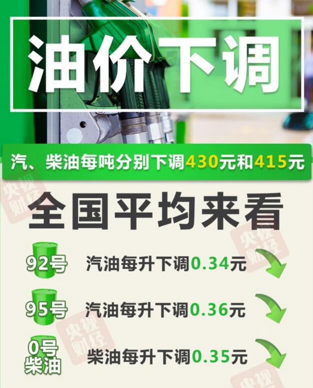 全國平均來看:92號汽油每升下調(diào)0.34元;95號汽油每升下調(diào)0.36元;0號柴油每升下調(diào)0.35元。