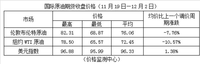 據(jù)國家發(fā)改委價格監(jiān)測中心監(jiān)測,本輪成品油調(diào)價周期內(nèi)(11月19日—12月2日)國際油價大幅下降。平均來看,倫敦布倫特、紐約WTI油價比上輪調(diào)價周期下降9.16%。