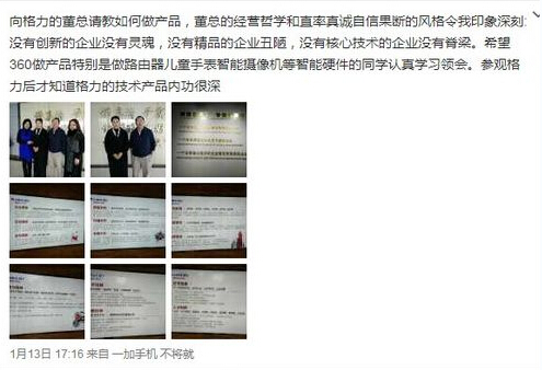1月13日,奇虎360董事長(zhǎng)周鴻祎在微博上透露,周近日參觀了格力并曬出與格力董事長(zhǎng)董明珠的合影。周表示,自己訪問的目的是向格力的董總請(qǐng)教如何做產(chǎn)品,并稱“格力的技術(shù)產(chǎn)品內(nèi)功很深”,“董總的經(jīng)營(yíng)哲學(xué)和直率真誠(chéng)自信果斷的風(fēng)格令我印象深刻”。該微博引發(fā)人們無數(shù)的猜想。
